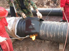4、將熱收縮套移至接頭處居中位置,取出隔離材料。從中間沿圓周方向均勻加熱,使其完全收縮后再分別向兩端延伸加熱。加熱時(shí)熱縮套允許受熱溫度不得超過(guò)250℃,注意用火均勻。待全部收縮完后,再重新加熱表面凹凸不平的地方,使其完全平整。整體加熱完畢后,調(diào)小火焰再重新加熱一遍,以使熱熔膠充分溢出。加熱過(guò)程中用壓輥將接頭輾壓幾遍,重點(diǎn)輾壓熔合搭接處,以排除氣泡。